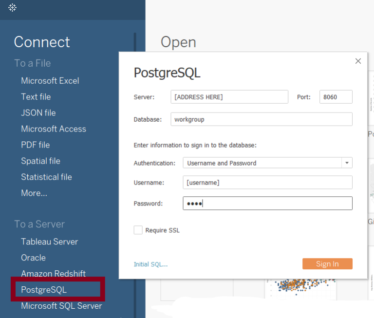 You can access the database directly from Tableau via the PostgreSQL Connector. You will need the following details for the authentication: