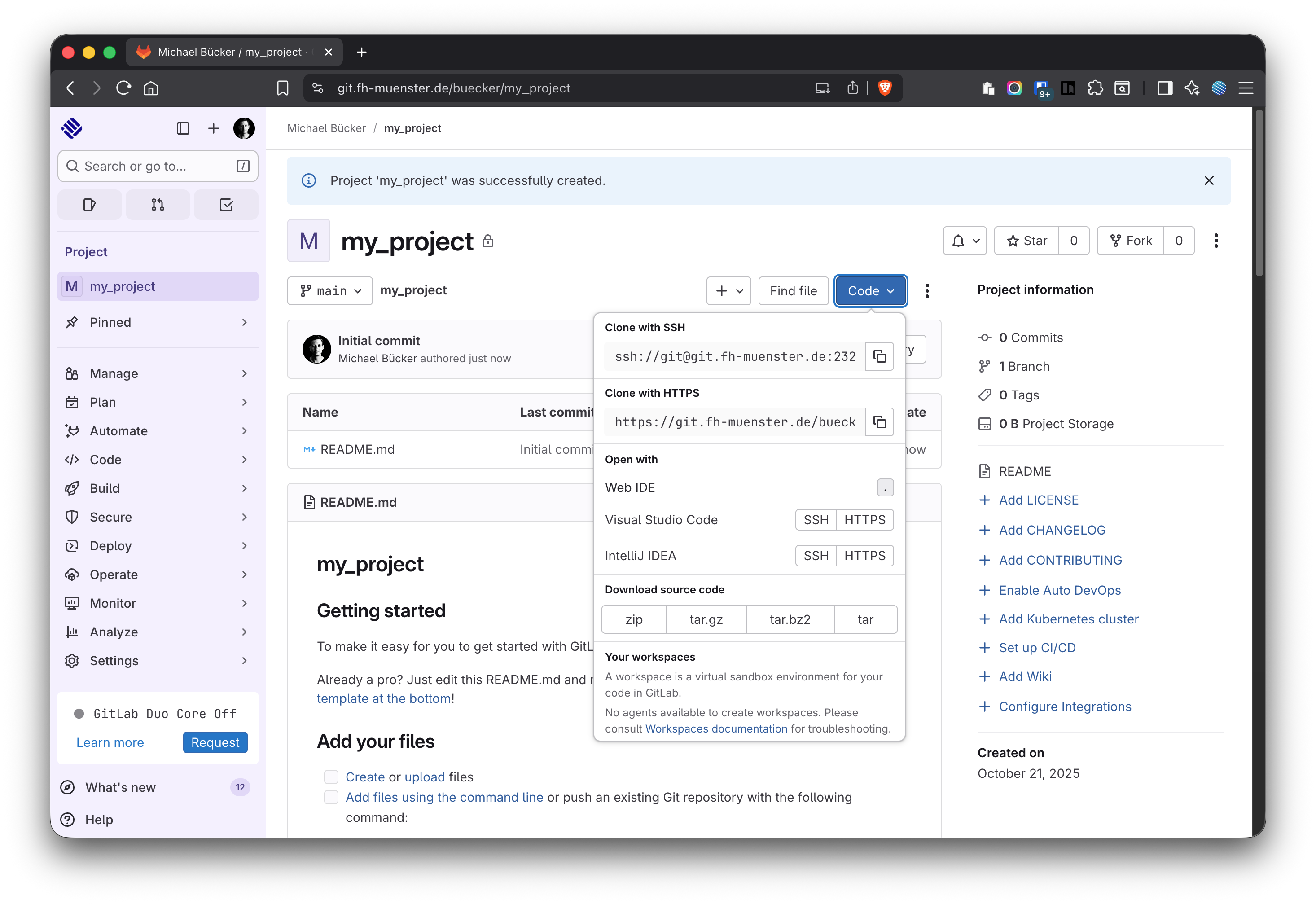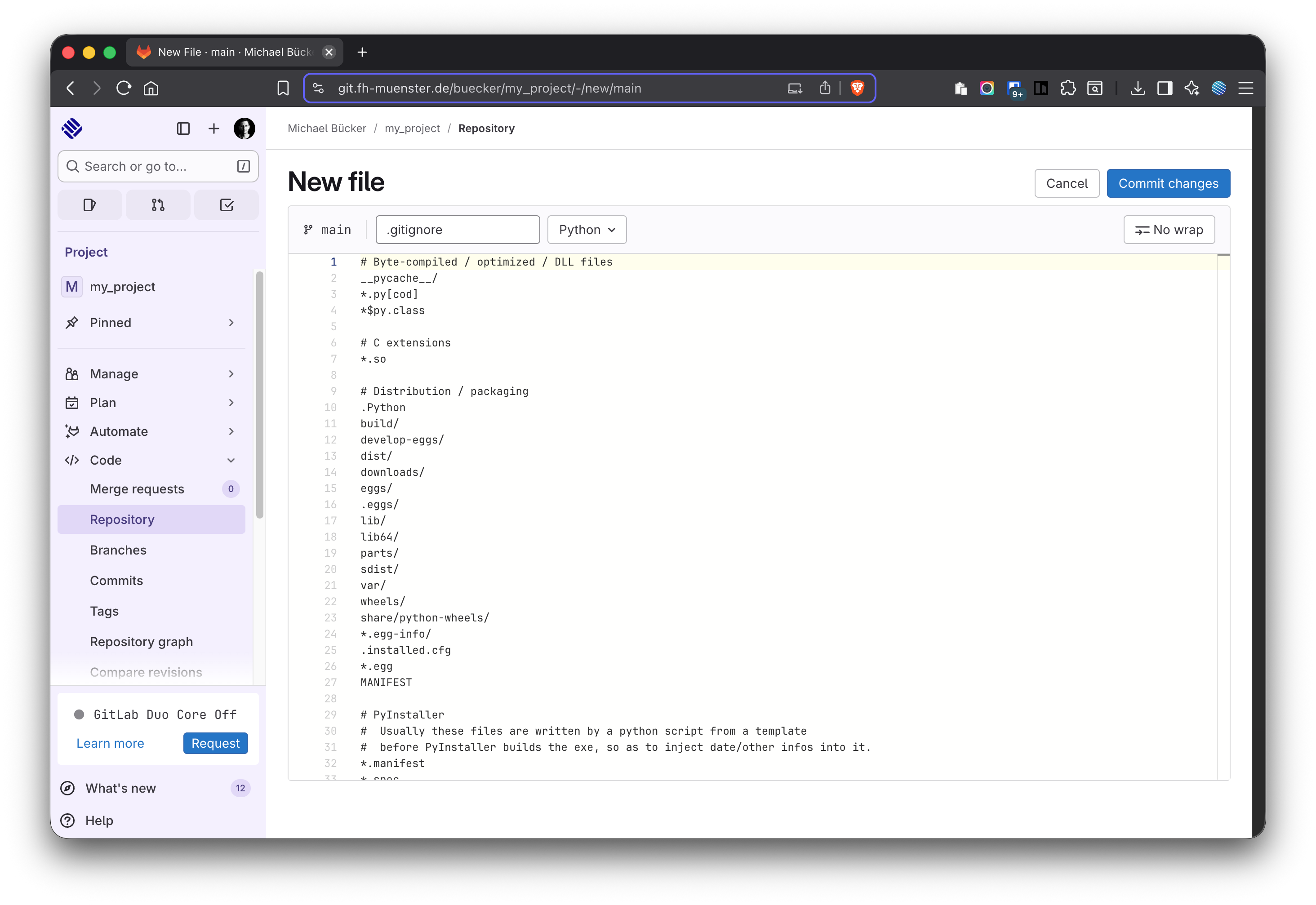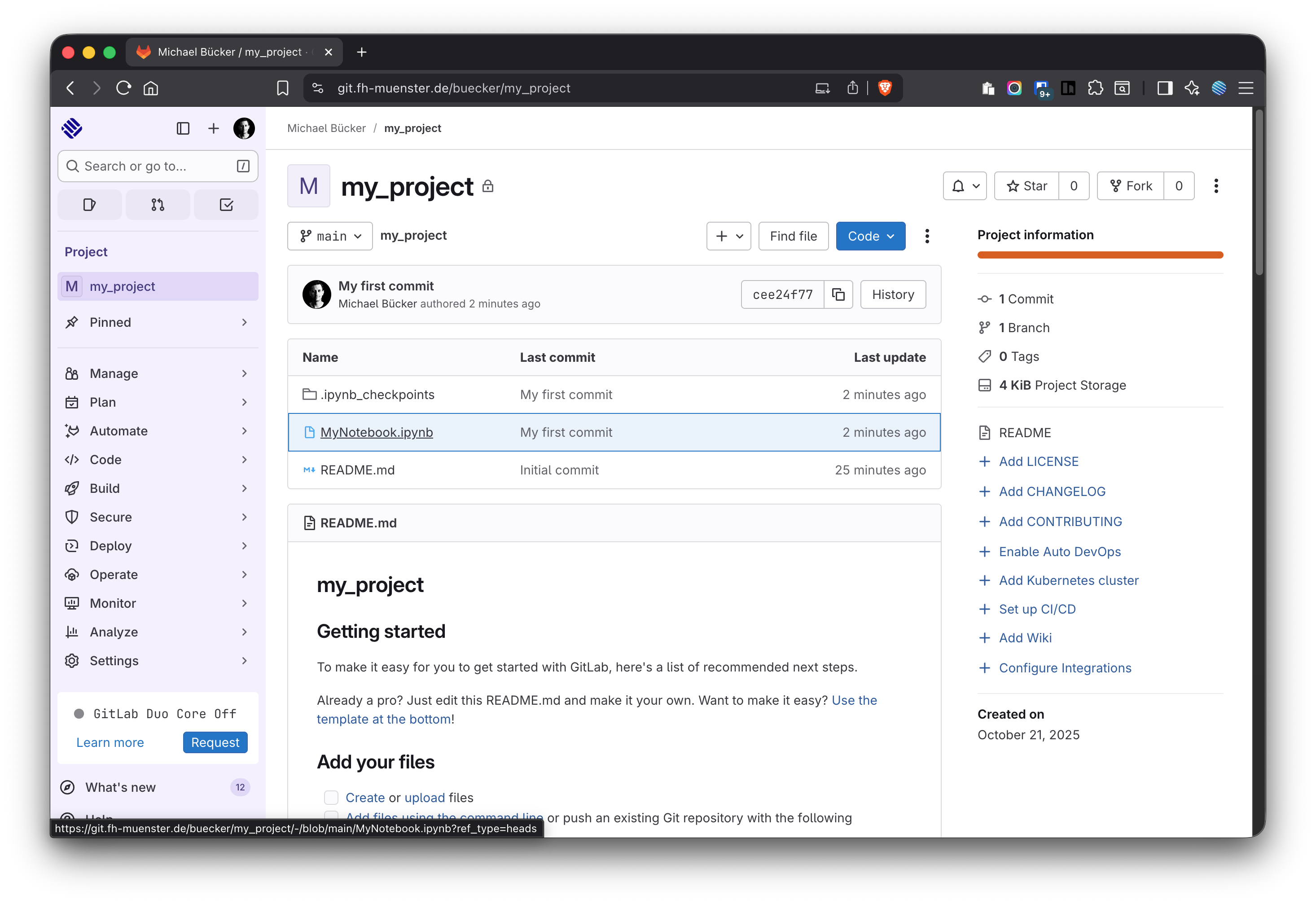 Figure 9: Create the .gitignore file in GitLab before cloning to JupyterHub