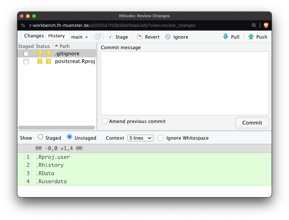 - Auswahl der Dateien mit Änderungen, die für die Zwischenspeicherung berücksichtigt werden sollen (sog. Staging) mit dem Button “Stage”.