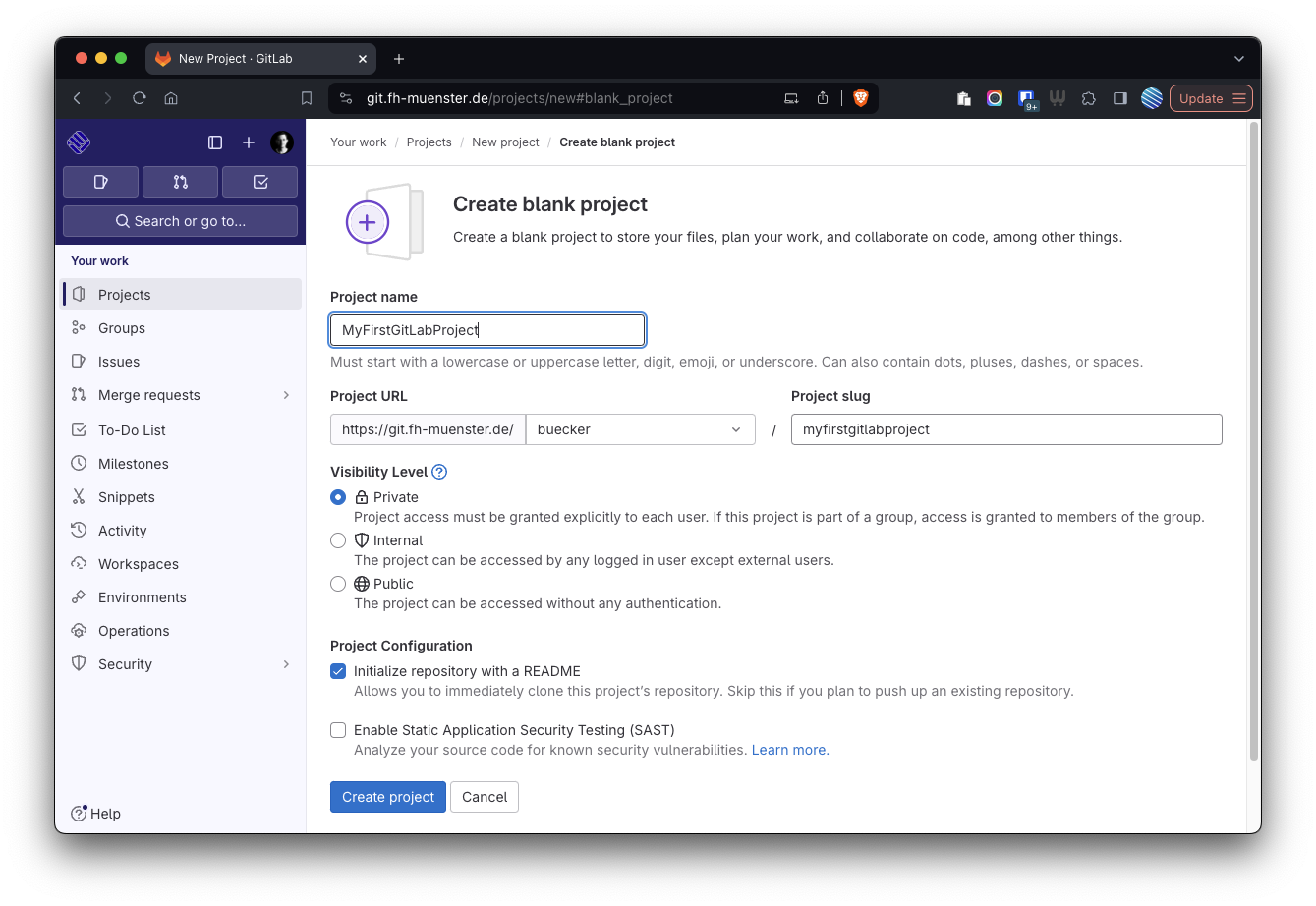 Anschließend müssen – wie in Abbildung 3 gezeigt – diverse Angaben für das Projekt gemacht werden, wie beispielsweise ein Name und ob das Projekt öffentlich verfügbar sein soll (“Public”), nur für FH Angehöre (“Internal”) oder nicht öffentlich (“Private”).