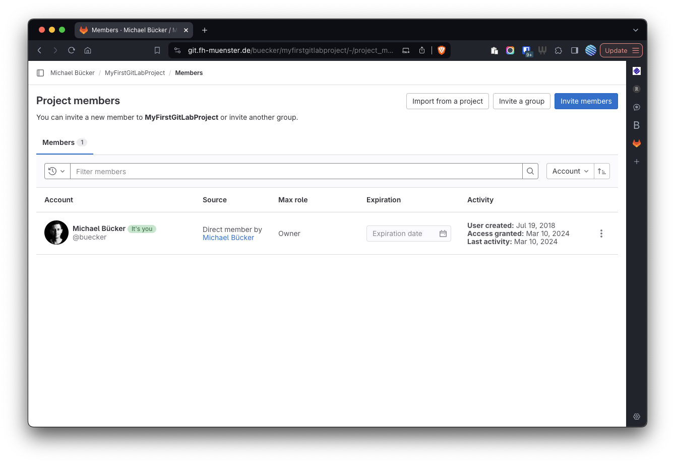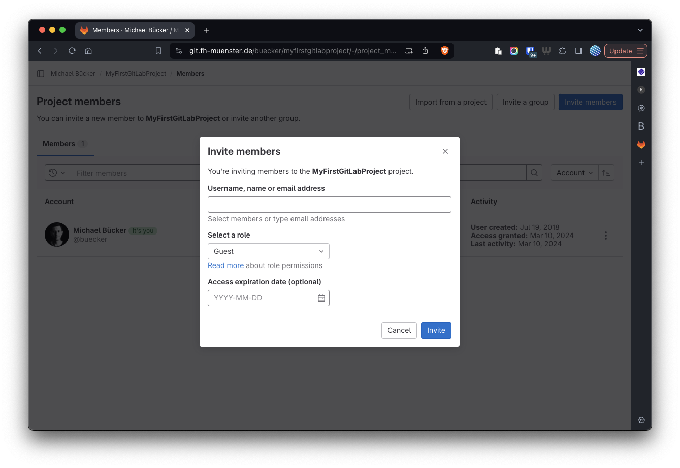 In GitLab lassen sich für ein Projekt weitere Personen zur Zusammenarbeit einladen. Im Hauptmenü des Projekt ist dies unter dem Punkt “Members” möglich (vgl. Abbildung 5).