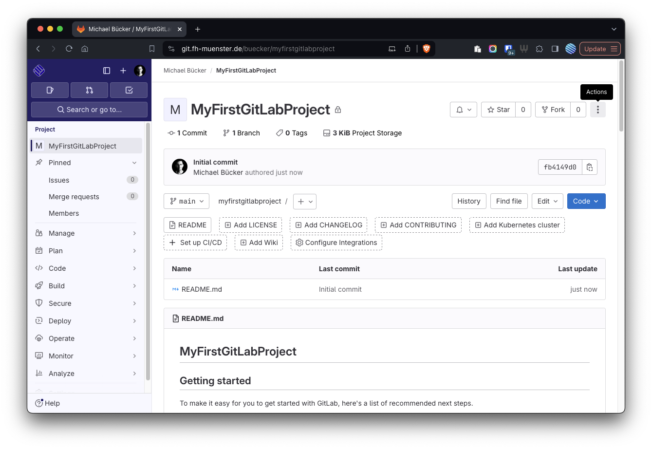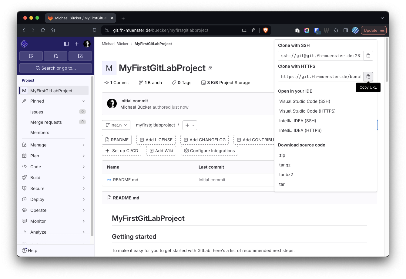 An der FH Münster wird für die Verwaltung von Code ein eigenes GitLab angeboten. Dies ist über git.fh-muenster.de (auch außerhalb des FH Netzes) per FH Login erreichbar.