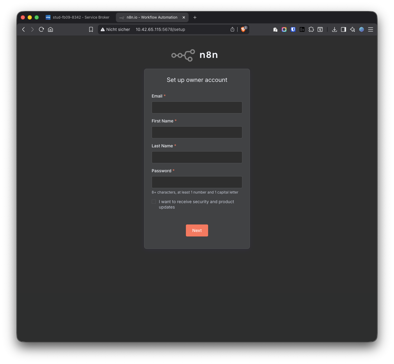 Öffnen Sie einen Browser und rufen Sie Ihren n8n-Server über den VM-Namen auf: