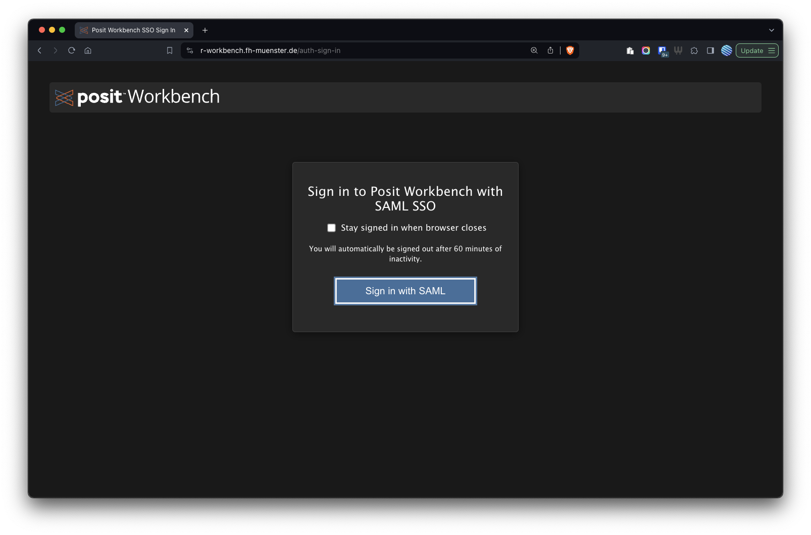 Um auf die Posit Workbench zuzugreifen, müssen Sie sich im Netz der FH Münster befinden. Dazu verbinden Sie sich entweder in den Gebäuden der FH mit dem eduroam WLAN oder greifen Sie von zu Hause aus über die VPN1 Verbindung zu.