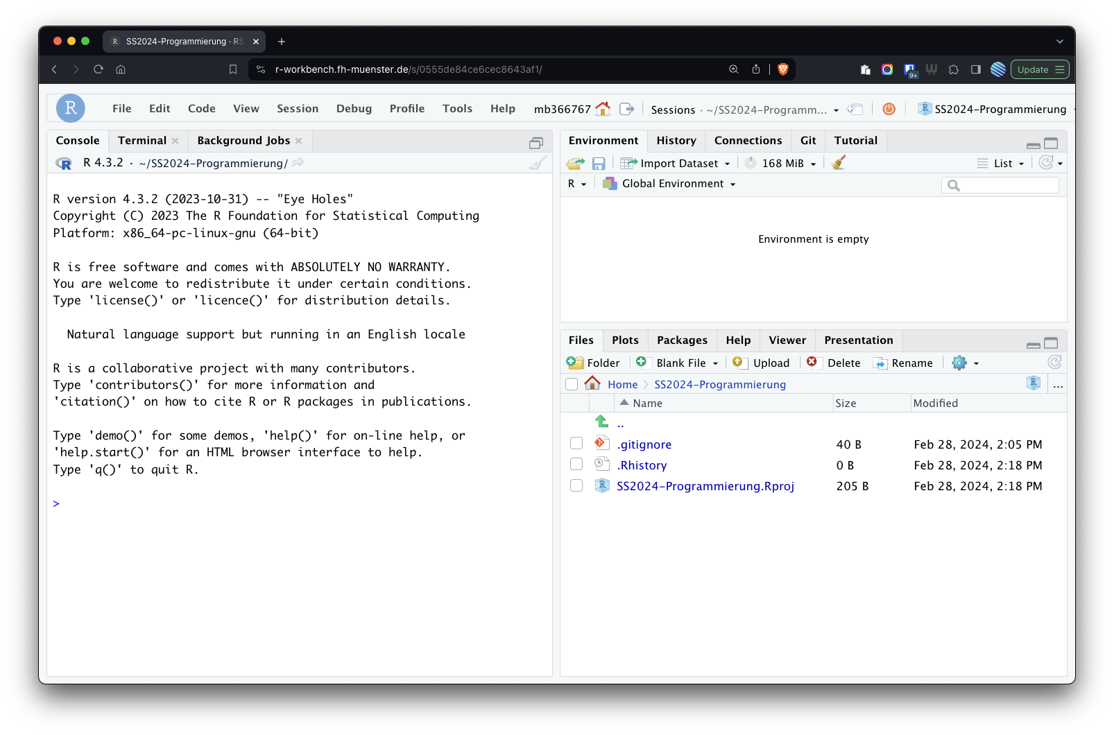 Eine vollständig eingerichtete Arbeitsumgebung finden Sie unter r-workbench.fh-muenster.de. Es wird wärmstens empfohlen, diese Arbeitsumgebung zu nutzen, es besteht aber auch die Möglichkeit, RStudio selbst zu installieren.